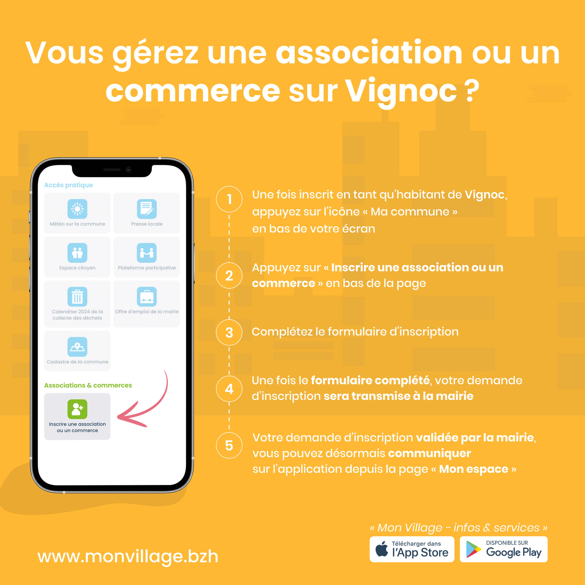 Conçue comme un service d’utilité publique, l’application Mon Village permet la circulation d’une information claire, rapide et efficace sur Vignoc.