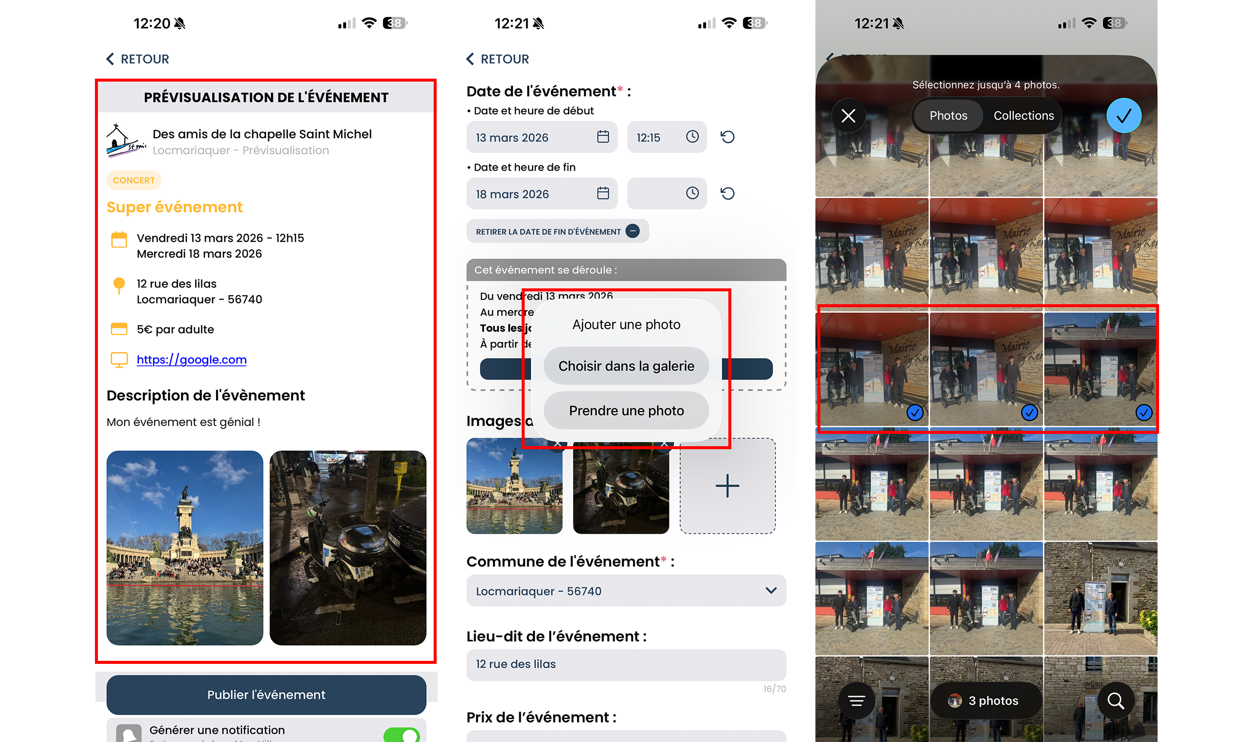 • il est désormais possible de prendre une photo directement depuis l’application Mon Village, en complément du choix d’une image dans la galerie du téléphone