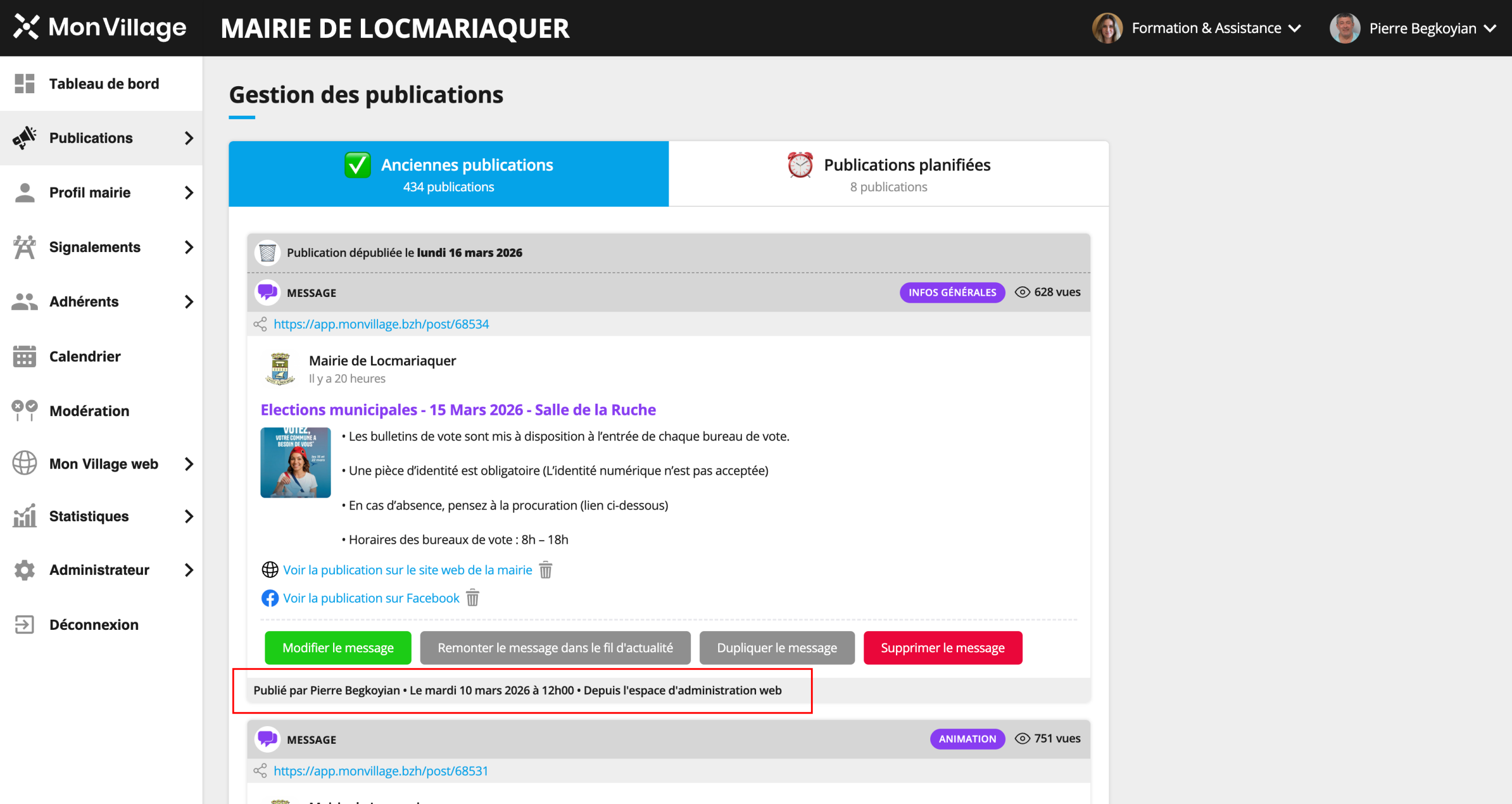 Lorsque les passerelles entre Mon Village et les sites web des mairies / EPCI sont en place, et que le paramétrage le permet, les publications des associations, commerces et services peuvent remonter sur les sites web des mairies / EPCI, soit automatiquement, soit après modération.