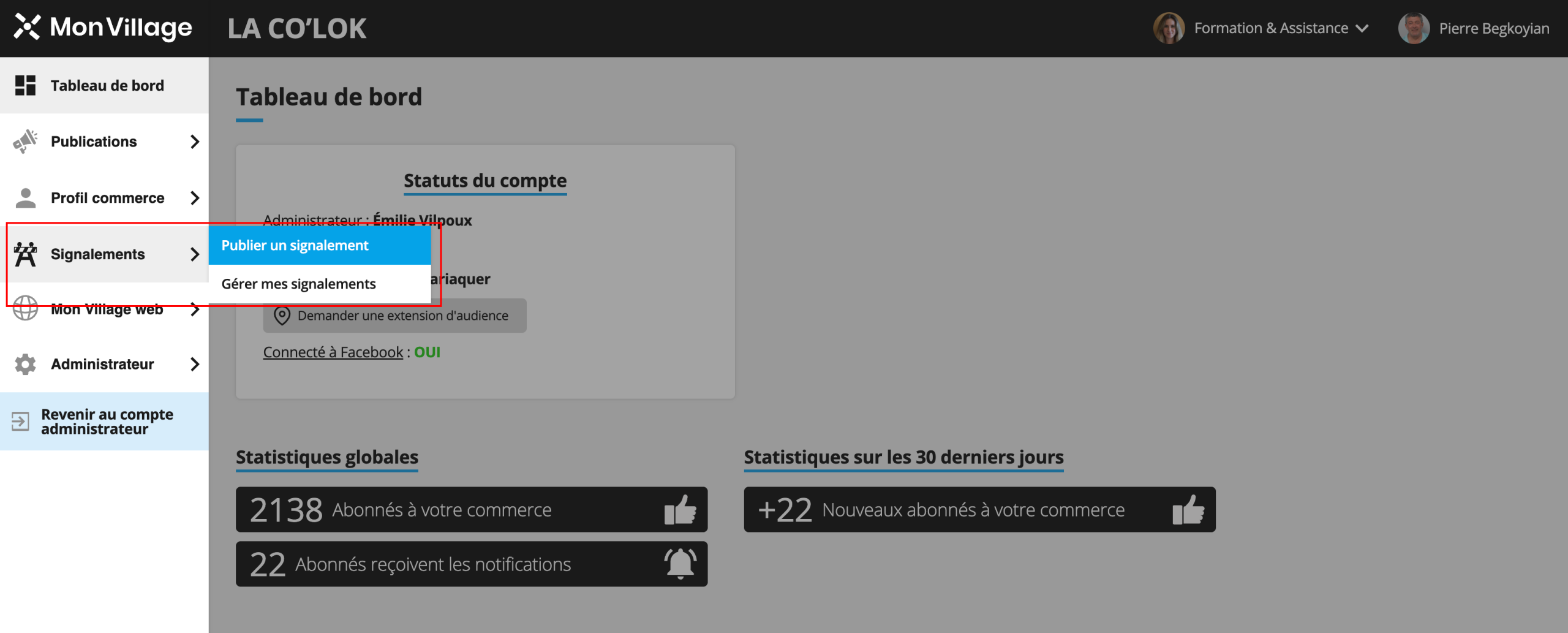 • la plateforme utilisée (espace administrateur web ou application mobile Mon Village)